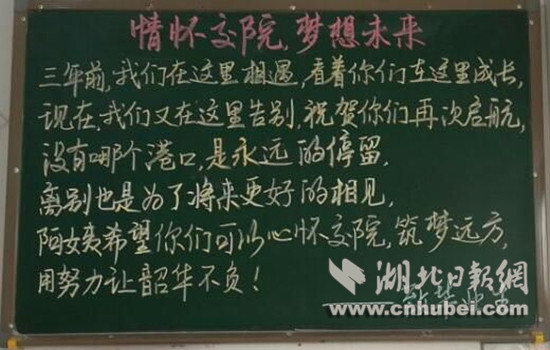 湖北日报网消息(通讯员 余雨龙)“没有哪个港口是永远的停留,离别也是为了将来更好的相遇!”近日,一段毕业赠言刷爆了武汉交通职业学院师生的朋友圈,这段毕业赠言出自该校临湖八舍宿管阿姨张小英之手,每年毕业季,她都会在宿舍大厅的小黑板上写下毕业赠言赠与毕业学子,至今已持续八年。