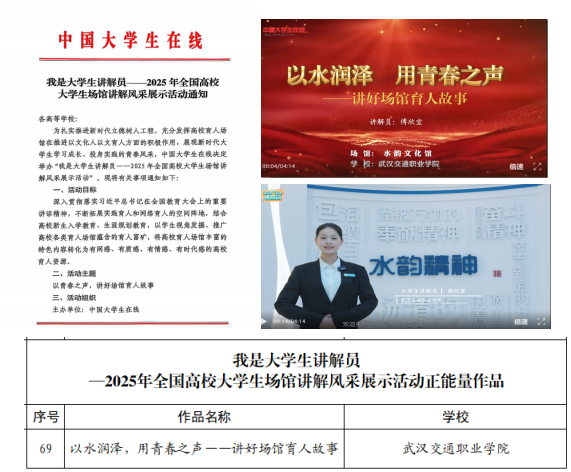 学校入选作品以2023年建成的集校史馆、思政教育基地和“水韵精神”展厅于一体的学校数字化文化场馆——“水韵文化馆”为讲解载体,围绕“水韵精神”主线,通过“启航篇”“扬帆篇”“笃学篇”“远航篇”四个篇章,系统呈现学校七十余年的发展历程与育人成果。讲解词以“水”为喻,从学校历史渊源、融合发展、校园文化到思政教育,生动展现学校“以水为魂、以交通为根”的办学特色。“水韵精神”讲解队学生讲解员傅欣宜以沉稳亲切的语调,结合珍贵历史影像,讲述学校从初创至今的奋斗故事,并重点介绍了在疫情期间挺身而出的学生“逆行者”、带着奶奶上大学的“湖北好人”等典型校友事迹。作品通过微信公众号、抖音、B站等新媒体平台推广,有效拓展了场馆育人的辐射范围与影响力。