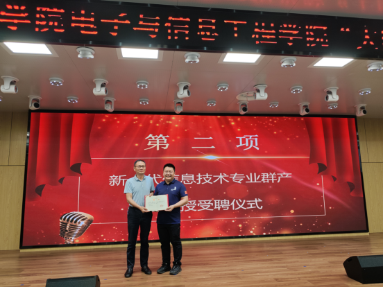 会上,电信学院院长胡迎九为梁攀颁发新一代信息技术专业群产业教授的聘书。